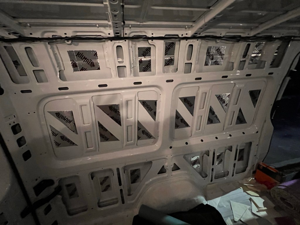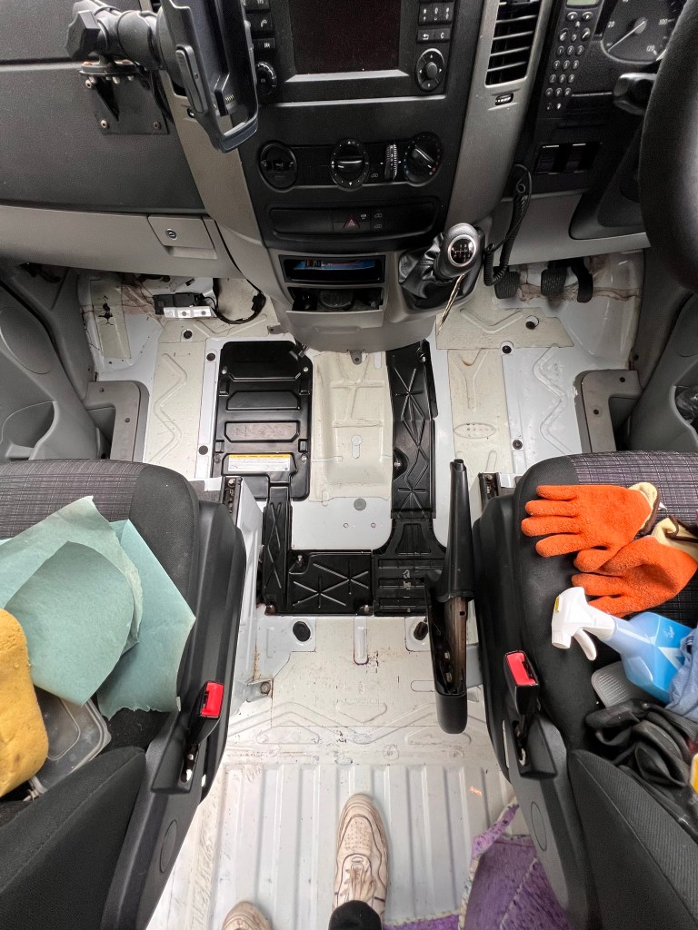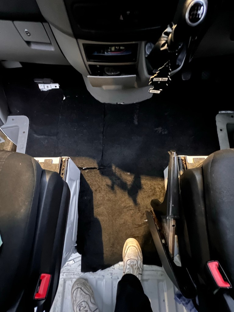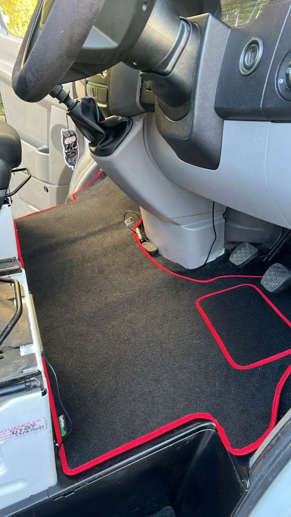 From then, things slowed down slightly. I bought some bits ready to insulate in the future and minor bits I could do now. So I have managed to fully insulate and tidy the front cab and it came out pretty beautifully if I do say so myself. Considering I had to shape and cut things in a tiny space it honestly looks pretty good. With some added RGB strips and a mat from Vanmats.co.uk, I am incredibly pleased with it. We did run into a snag where the cab was flooding because water was pooling near the wheel arch. After hours of searching the web and asking in forums, nobody seems to know WHERE the water was getting in from and nobody had a real solution. So we had to go with most people’s simple solution of “Drill a hole under where the water is pooling.” As it turns out that is actually probably the only fix and the water only drains onto the wheel so no harm no foul.